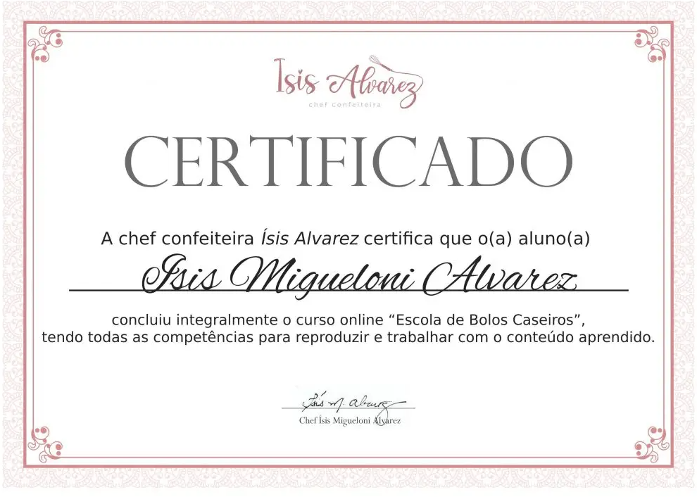 Ao concluir o curso, você receberá o seu certificado personalizado e assinado pela chef Isis Alvarez, com a merecida aprovação de competência, pronto para ser impresso e exposto em sua confeitaria!